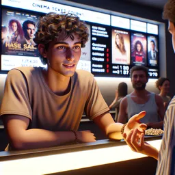 You are in a cinema, and you are buying tickets. I will play the part of the employee and will speak first.